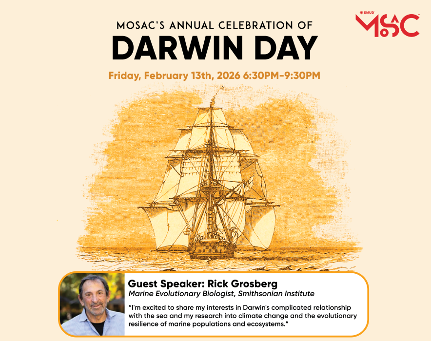 The second longest-running Darwin Day celebration in the world is happy to be back at MOSAC. This annual celebration features a science presentation and draws individuals who hold science in high regard and want to sustain scientific integrity of school curricula and programs. For the fourth consecutive year the celebration will be held in the state-of-the-art planetarium at the SMUD Museum of Science and Curiosity on February 13, 2025, 6:30 pm – 9:30 pm at 400 Jibboom St. Sacramento, California. Learn More and reserve your tickets.
